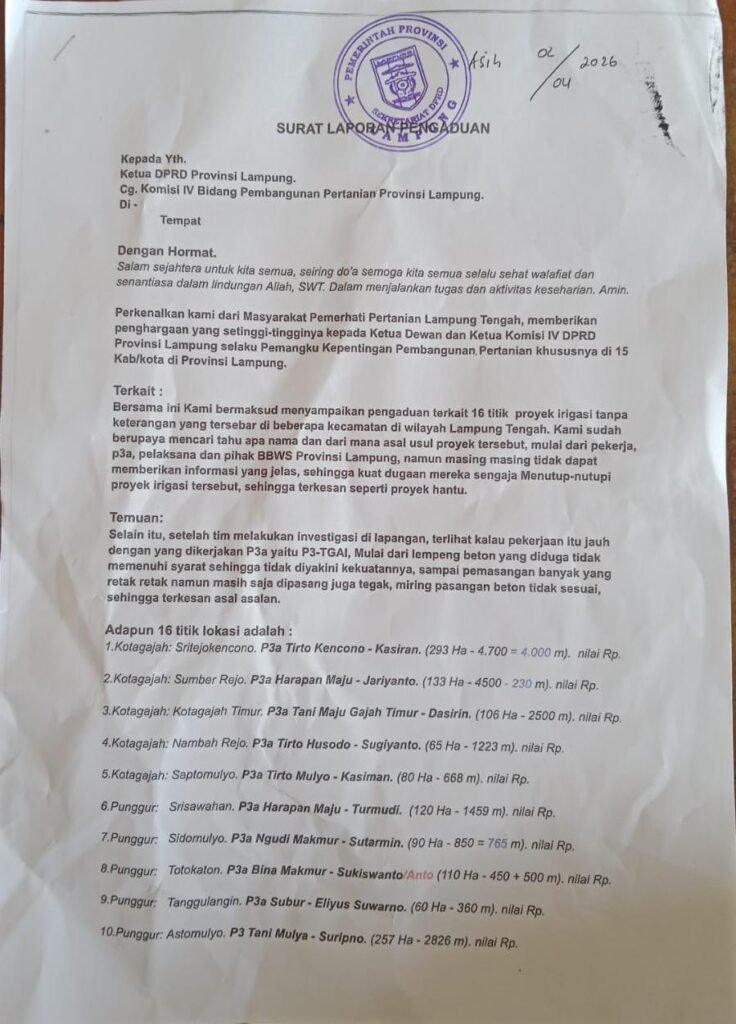 ”Hari ini saya mendampingi beberapa masyarakat pemerhati pertanian Lampung Tengah menyambangi kantor DPRD Provinsi Lampung untuk sampaikan surat laporan pengaduan tentang proyek irigasi inpres 2 tahun 2025 di Lampung Tengah yang di keluhkan masyarakat penggunanya, pasal dalam pengerjaan dan hasil nya tidak memuaskan” ucap Abdullah Ketua DPC JMI Lampung Tengah.