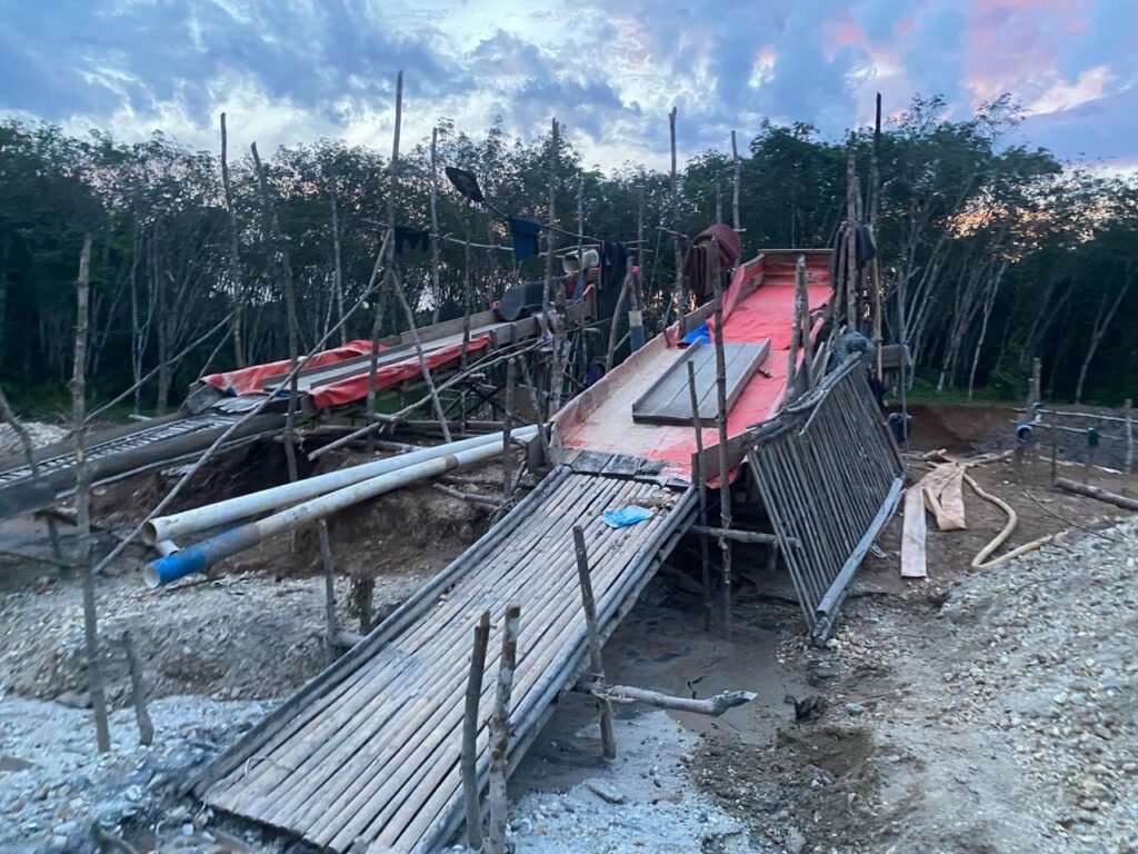Dari informasi dari masyarakat tersebut. Petugas berhasil mengamankan terhadap peralatan penambangan seperti 2 unit mesin dongpeng, 2 asbuk, 5 pipa paralon, selang gabang 20 meter, 4 selang monitor, 1 mesin NS, 5 karpet mie (untuk menyaring mineral emas) 20 derigen kosong, dan 1 alat berat eksavator merek cat yang terparkir disemak semak.