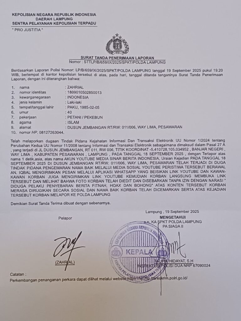 Lampung, https://Kharismanews— Zahrial, warga Lampung yang menjadi korban fitnah dan ujaran kebencian di dunia maya, mendesak Subdit Cyber Ditreskrimsus Polda Lampung segera menangkap para pembuat konten fitnah yang telah mencemarkan nama baik dirinya dan keluarganya.