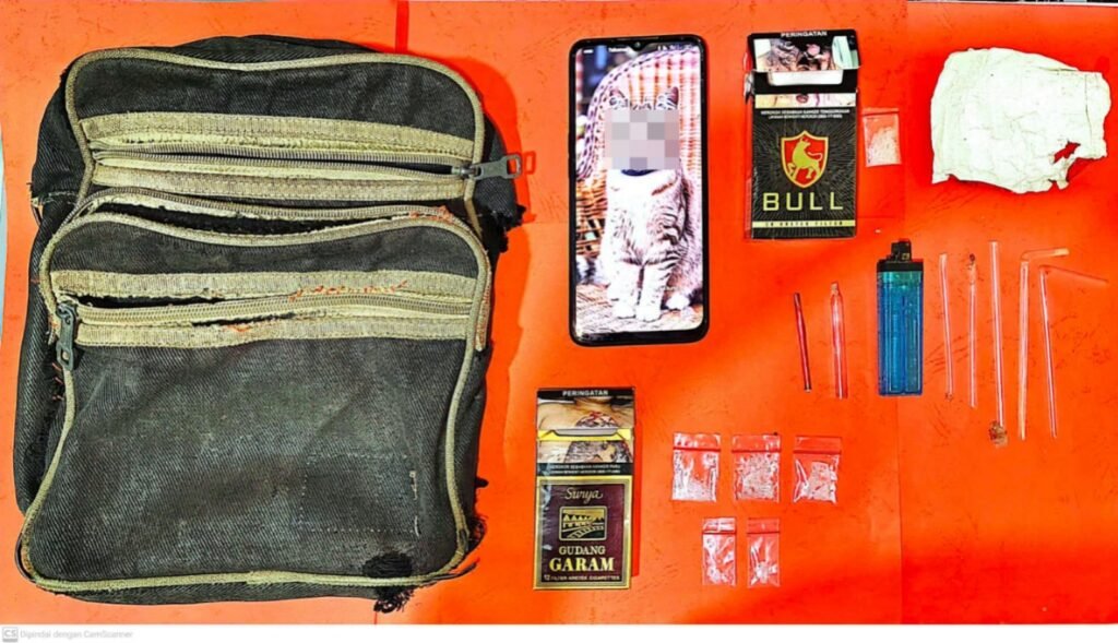 Dalam perkara ini barang bukti yang berhasil diamankan petugas, yakni berupa tas berwarna coklat moka yang didalamnya terdapat rokok merek BULL yang didalamnya terdapat plastik klip berukuran 3×2 cm berisikan kristal putih yang diduga narkotika jenis sabu yang dibalut oleh kertas timah warna merah dengan berat bruto 0,25 (nol koma dua lima) gram.