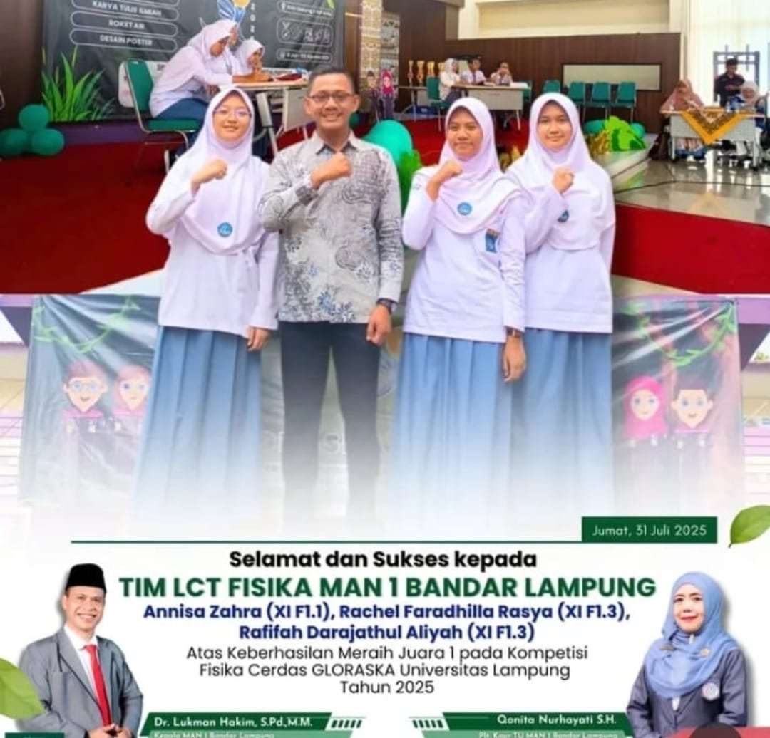 Siswa MAN 1 Bandar Lampung berhasil menjuarai lomba Kompetensi Fisika Cerdas (KFC) GLORASKA 2025 yang diselenggarakan oleh Jurusan Fisika Fakultas Keguruan dan Ilmu Pendidikan Universitas Lampung (31.07.2025).