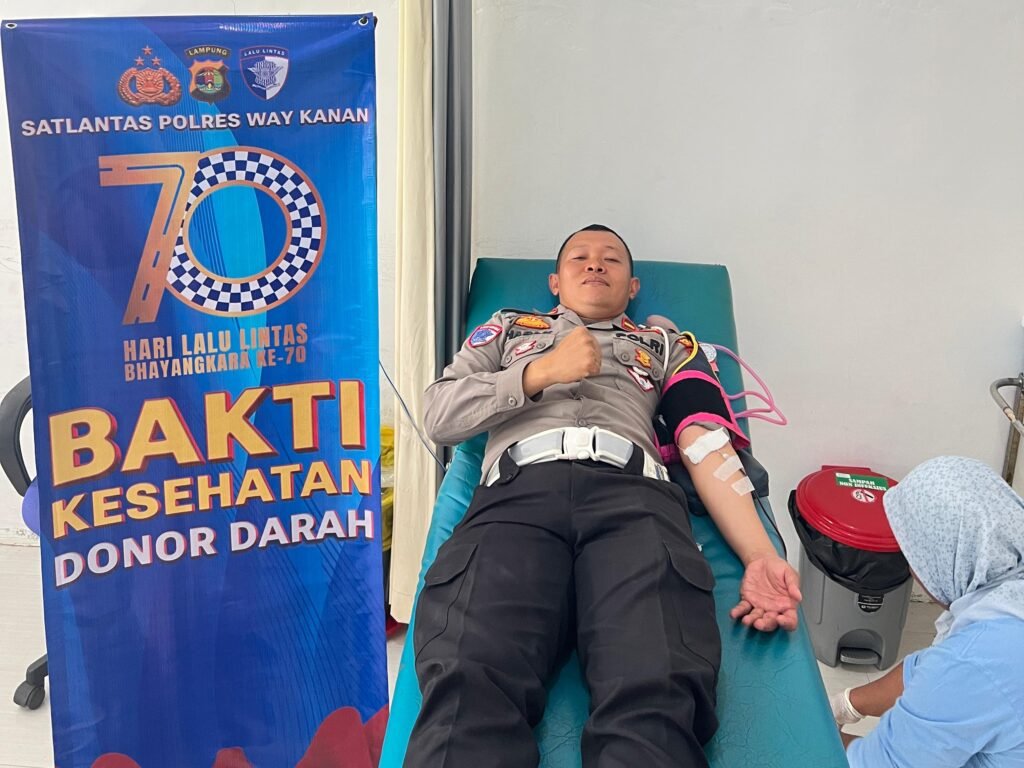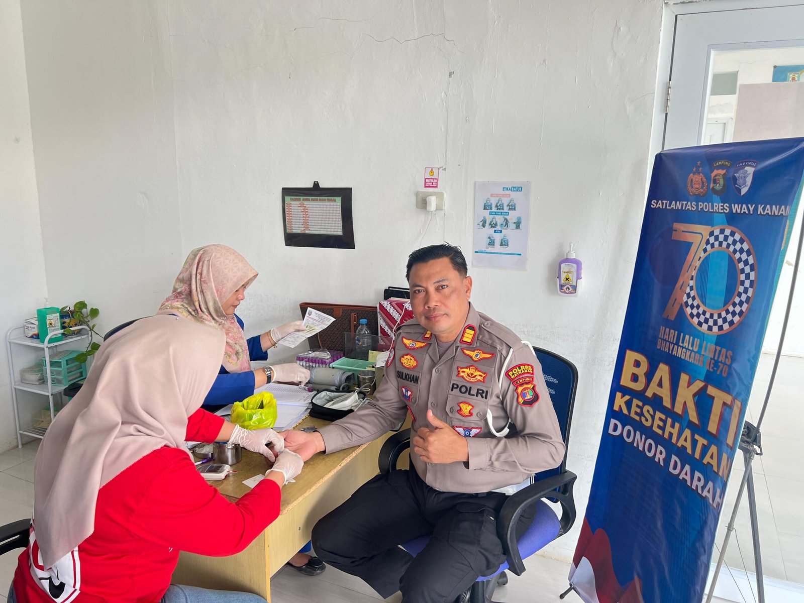 Kapolres Way Kanan AKBP Adanan Mangopang melalui Kasatlantas Polres Way Kanan AKP Sulkhan menuturkan, pihaknya turut berpartisipasi menyumbangkan darahnya dalam rangka Hari Lalu Lintas Bhayangkara ke-70 tahun 2025.