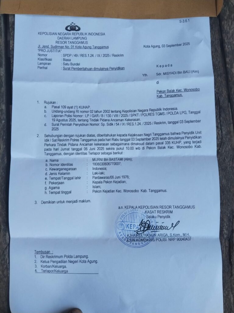 Tanggamus. — Setelah memasuki minggu ke tiga Laporan Polisi terkait ancaman pembunuhan terhadap Misyadi yang dilakukan oleh oknum Kepala Desa (Kakon) Murni. Pekon Kejadian Kecamatan Wonosobo Kabupaten Tanggamus Lampung yang dilaporkan dengan Nomor LP/GAR/130/VIII/2025/SPKT/POLRES TGMS/POLDA LPG, tanggal 19 Agustus 2025 tentang tindak pidana ancaman kekerasan.dan Surat Perintah Penyidikan dengan Nomor SP.Sidik/54/IX/RES.1.24/2025/RESKRIM, tanggal 03 September 2025.