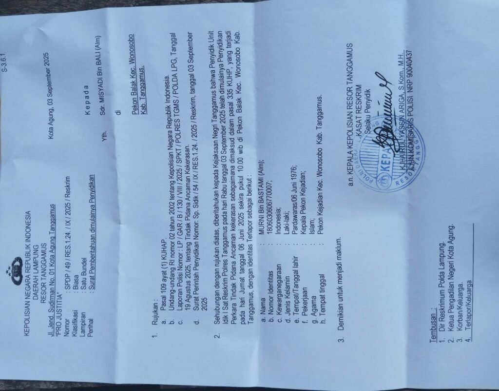 Yang mana isi surat tersebut bahwa Pihak Penyidik Polres Tanggamus sudah menyampaikan surat Pemberitahuan Dimulainya Penyidikan ke Kejaksaan Negeri Tanggamus Lampung tertanggal 03 September 2025 kemarin.” Ungkep pelapor.