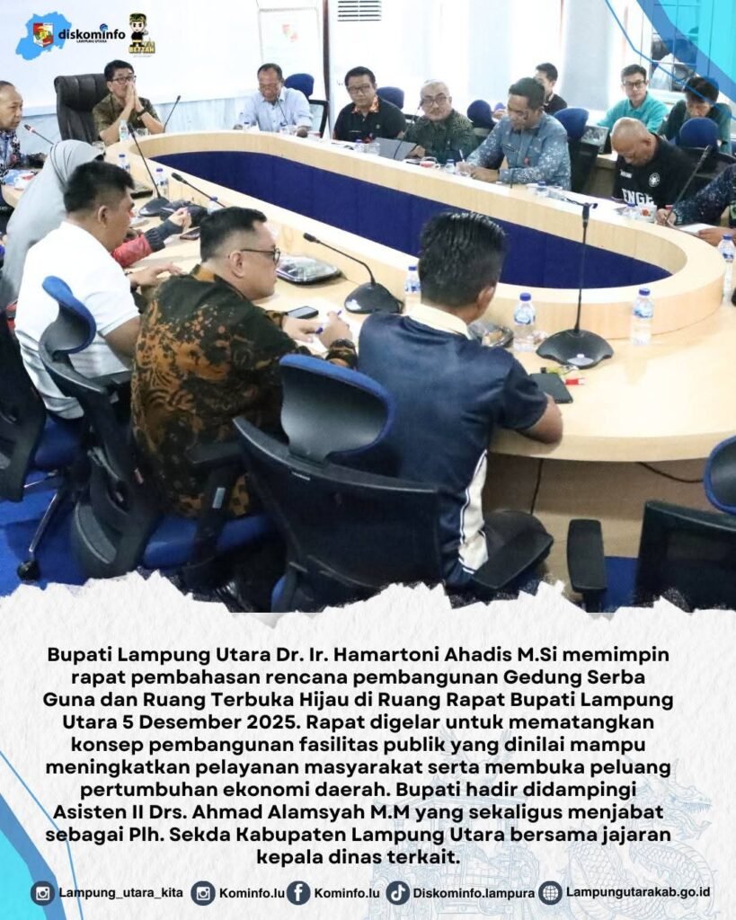 Lampung Utara,https://Kharismanews– Bupati Lampung Utara Dr. Ir. Hamartoni Ahadis M.Si memimpin rapat pembahasan rencana pembangunan Gedung Serba Guna dan Ruang Terbuka Hijau di Ruang Rapat Bupati Lampung Utara 5 Desember 2025. Rapat digelar untuk mematangkan konsep pembangunan fasilitas publik yang dinilai mampu meningkatkan pelayanan masyarakat serta membuka peluang pertumbuhan ekonomi daerah. Bupati hadir didampingi Asisten II Drs. Ahmad Alamsyah M.M yang sekaligus menjabat sebagai Plh. Sekda Kabupaten Lampung Utara bersama jajaran kepala dinas terkait.