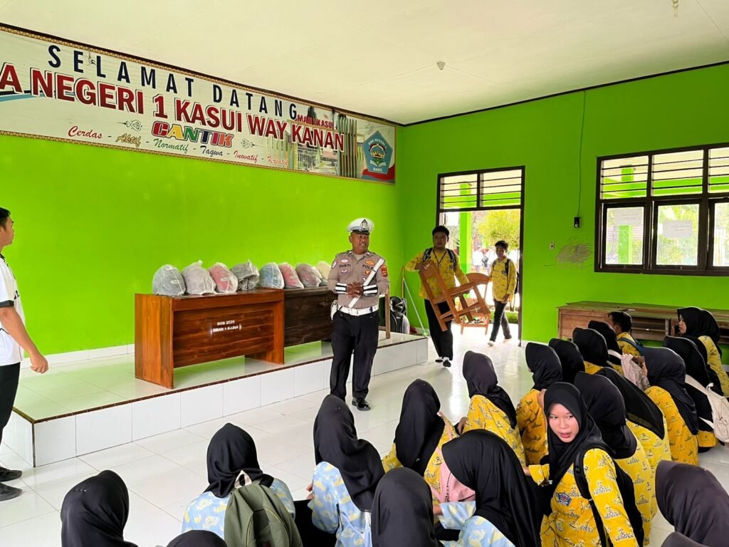 Waykanan,https://Kharismanews–Satuan Lalu Lintas (Satlantas) Polres Way Kanan mengadakan kegiatan Police Goes to School di SMAN 1 Kasui, Kecamatan Kasui Kabupaten Way Kanan untuk meningkatkan dan menanamkan kesadaran disiplin berlalu lintas sejak dini. Senin (8/12/2025).
