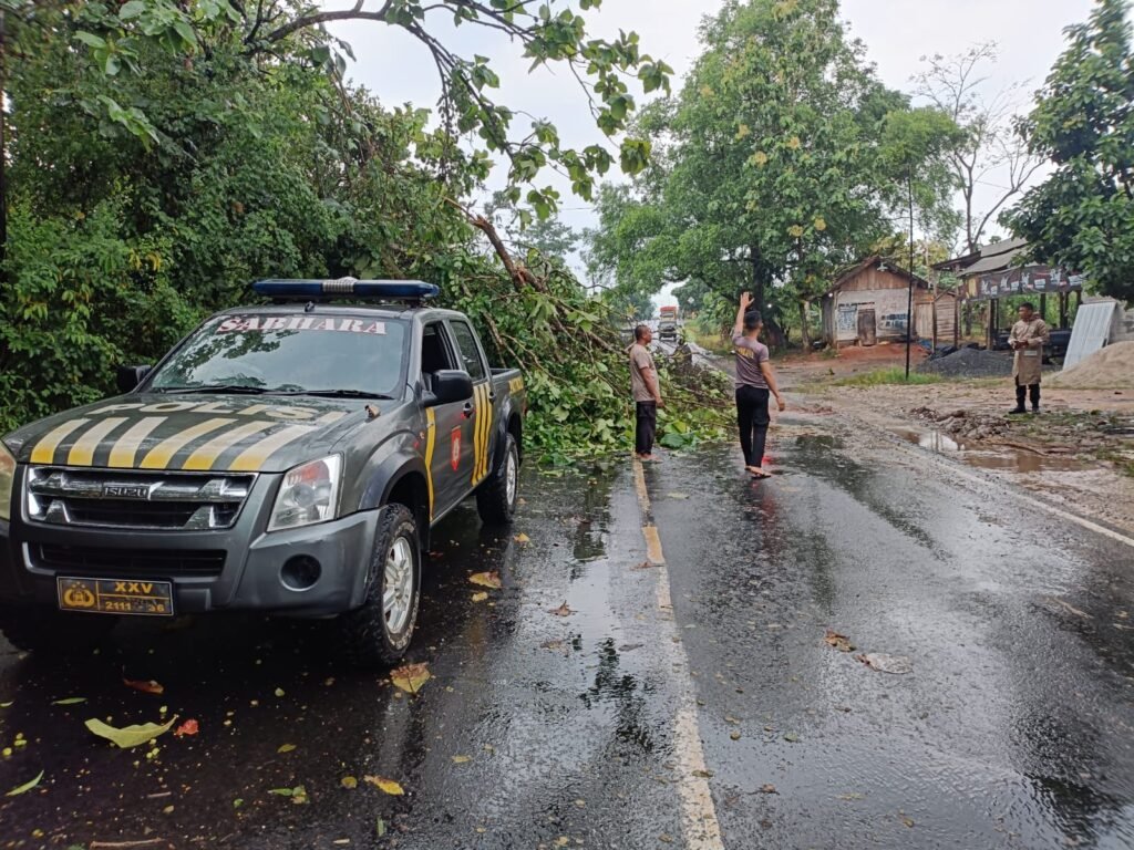 Polisi Evakuasi Pohon Jati Tumbang di Jalinsum Kampung Gedung Pakuon