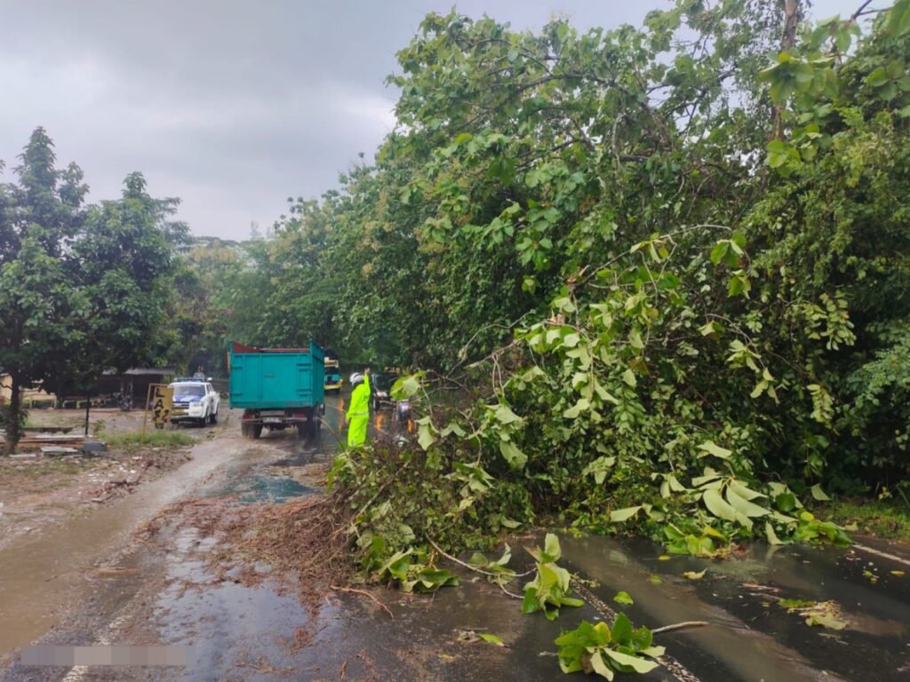 Tibanya dilokasi pohon tumbang, personel Kepolisian dibantu warga sekitar bergotong royong mengevakuasi batang pohon tumbang yang sempat sedikit mengganggu pengguna jalan yang melintas jalan tersebut.