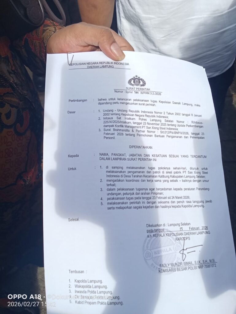 Lampung Selatanhttps://kharismanews-Proses penjualan besi behel hasil Produksi milik PT San Xiong Steel Indonesia yang berlokasi di Desa Tarahan, Kecamatan Katibung Lampung Selatan, di Hadang oleh personil kepolisian Sat SAMAPTA Polda Lampung, menjadi pemicu penundaan pembayaran ratusan buruh. penghadangan proses penjualan diketahui atas perintah dan arahan Kapolda Lampung Irjen.Helfi Asegaf, pada Jum’at 27 Februari 2026