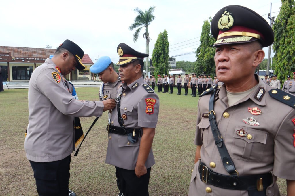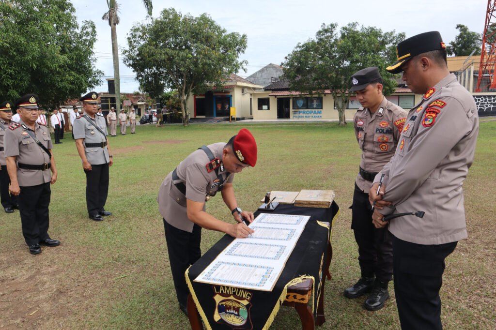 Waykanan,https://Kharismanews–Polres Way Kanan gelar upacara Serah Terima Jabatan Kabag Logistik, Kasipropam, Kasikum, Kapolsek Pakuan Ratu dan Kapolsek Gunung Labuhan serta pelantikan Kasatreskrim bertempat di lapangan apel Parama Satwika Polres Way Kanan. Jum’at (7/11/2025).
